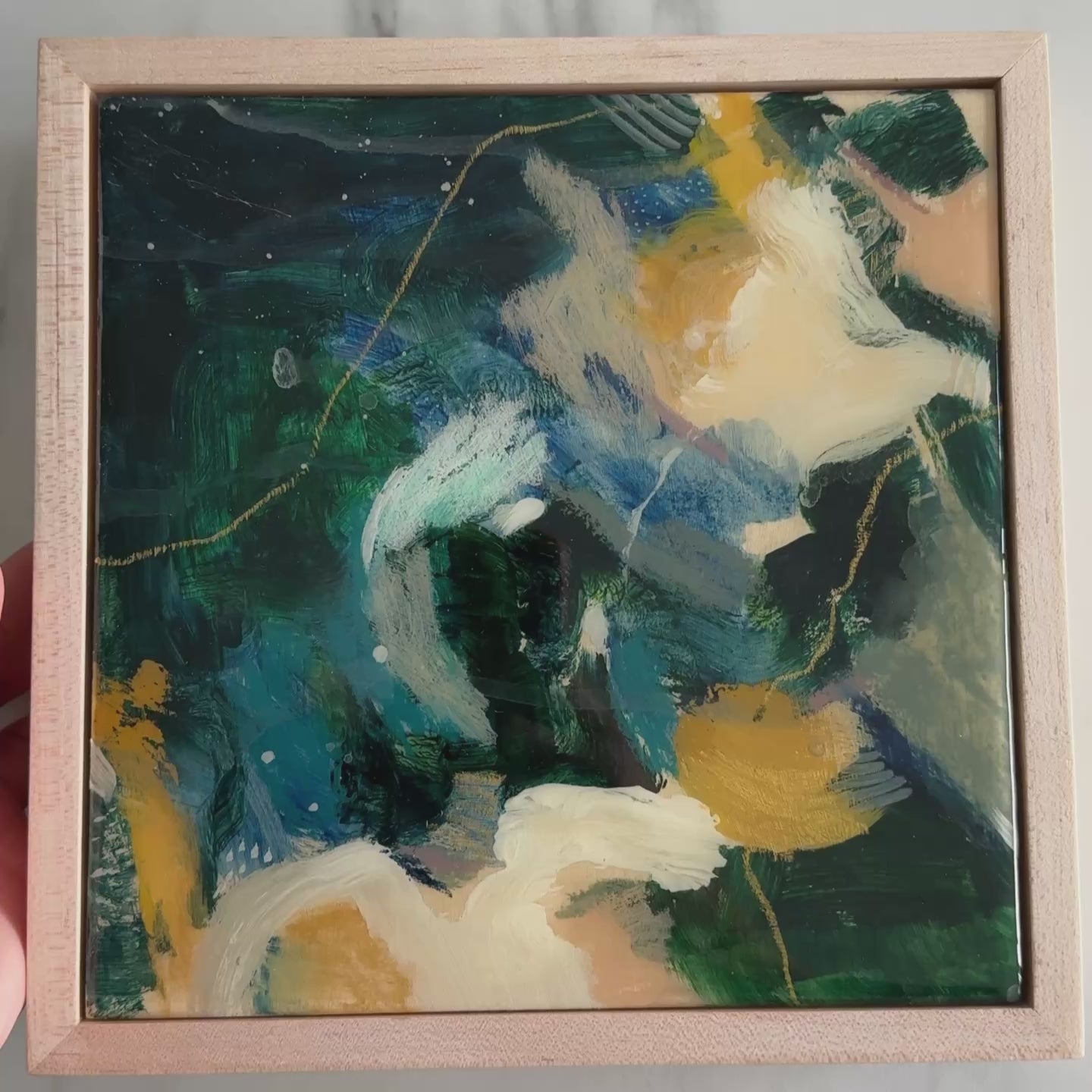 - Acrylic paint and gold metallic pastel on cradled wood, sealed with hard clear glossy hand-poured resin.