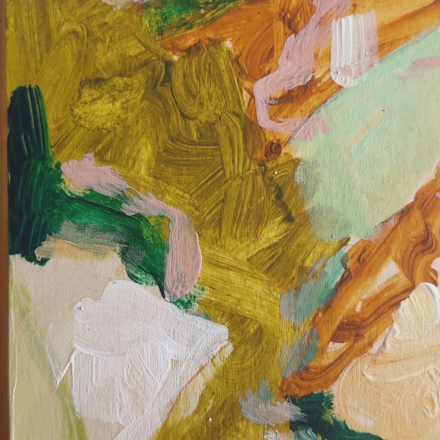 Original abstract acrylic and oil pastel painting on wood panel with maple frame.