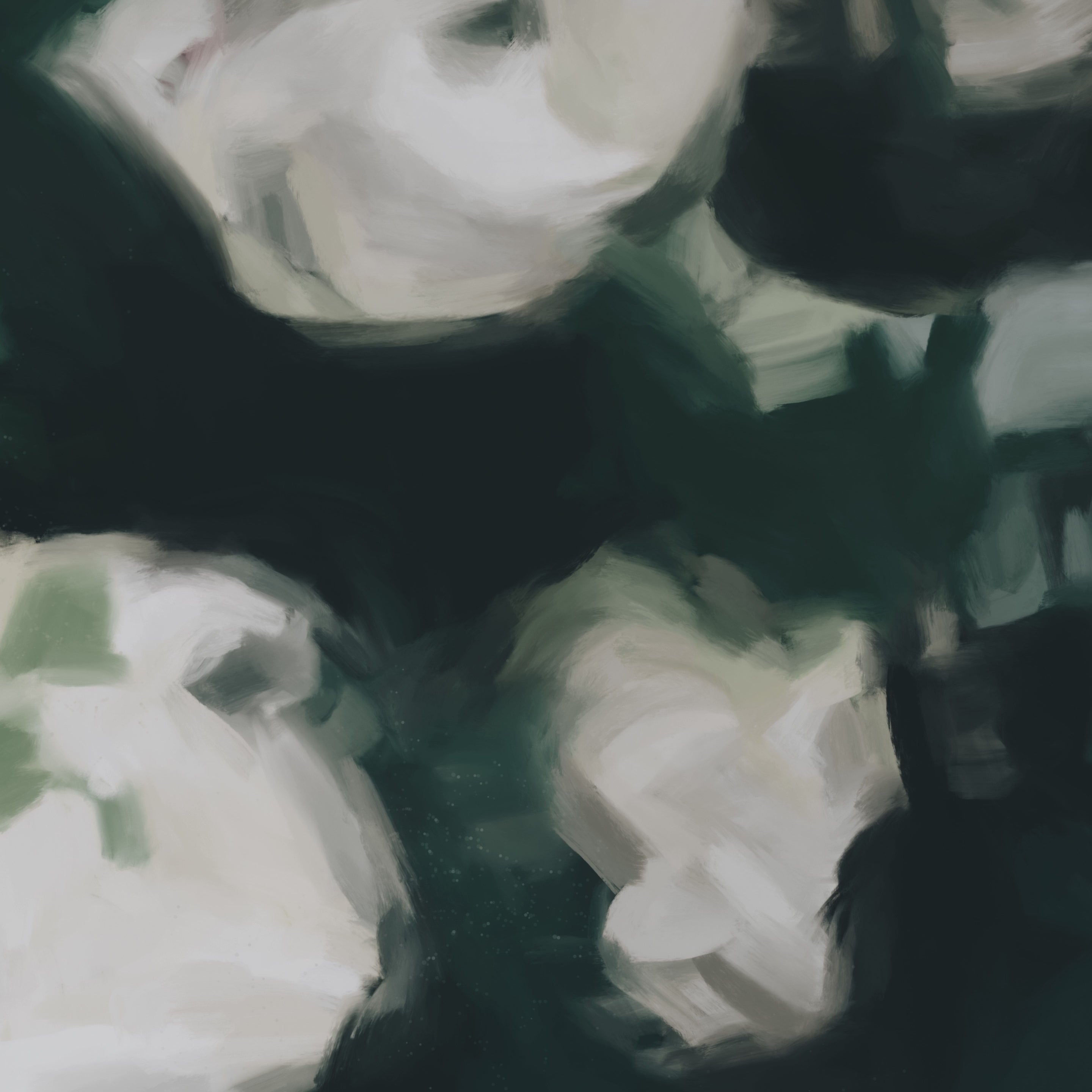 This piece was inspired by the mix of rich green foliage and soft white gardenia petals. I love how those colors play off each other. They're bold but peaceful at the same time. The abstract shapes capture that feeling of balance.
